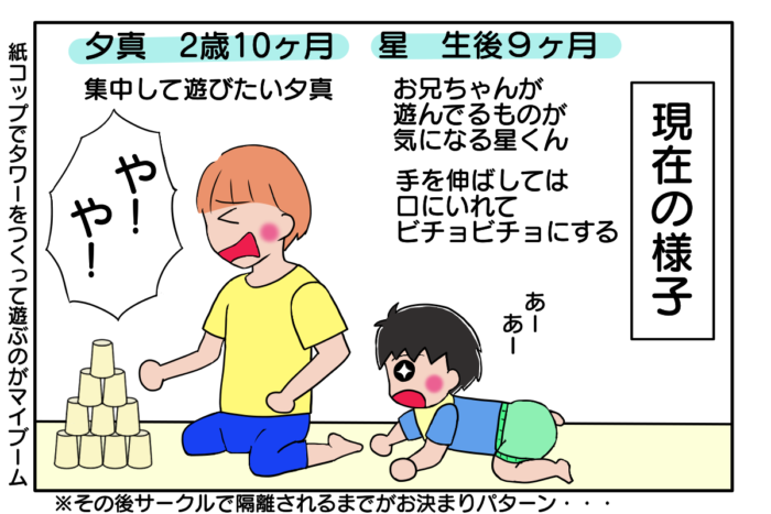 でも夕真は一人で集中して遊びたい、完成させたいという思いもあり怒ったり泣いたりとするので、星を抱っこしてサークルごしに別々に遊ばせるようにしています・・・